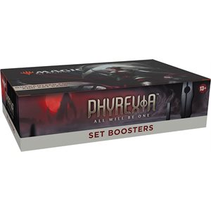 The Phyrexia: All Will Be One Set Booster Box contains 30 Phyrexia: All Will Be One Set Boosters. Each Set Booster contains 12 Magic cards, 1 Art Card, and 1 token/ad card or card from “The List” (a special card from Magic's history or Universes Within card—found in 25% of packs).
